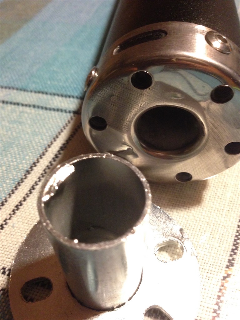 案の定、内側の溶接痕が邪魔でチャンバーのパイプに刺さらず、ヤスリで削り落として装着。