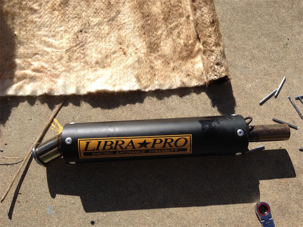 チャンバーを交換してからほぼ1年、爆音マフラーに輪が掛かってきたので、グラスウールの巻き直しを試みる。