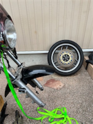 右腕を伸ばしたり、重い物を持ったりできないので、タイダウンベルトで支えながらアクスルシャフトを抜いて、ホイールを外す。